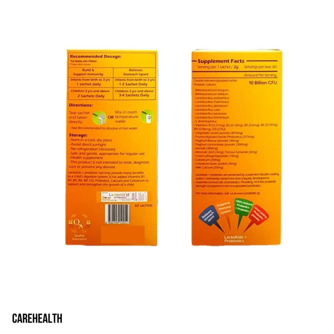 DOSAGE (build & support immunity): - Infants from birth to 3 years old: 1 sachet daily (after meal), Kids 3 years and above: 2 sachets daily. DOSAGE (relieves stomach upset): - Infants from birth to 3 years old: 1-2 sachets daily (after meal), Kids 3 years and above: 3-4 sachets daily. Can be taken directly (Simply tear along the grey perforated line on the sachet)